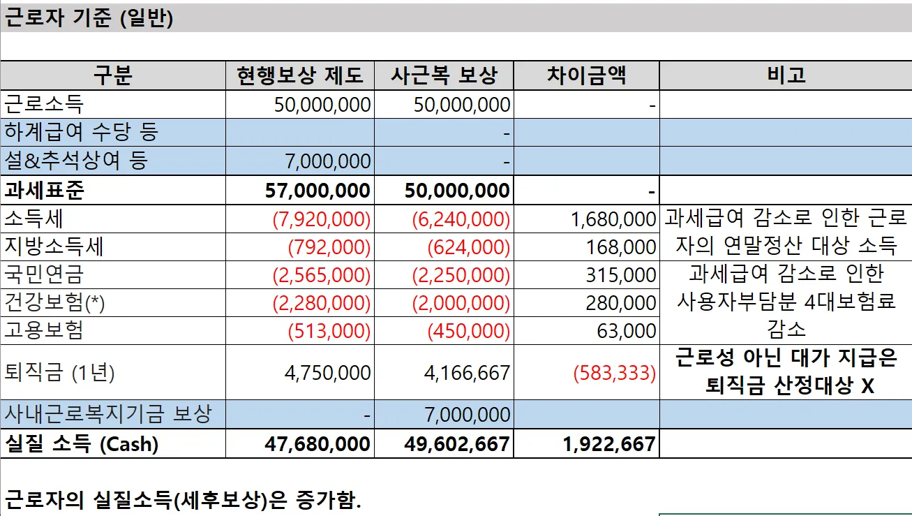 근로소득과 세후보상이 증가하며, 실질 소득(Cash)은 47,680,000원에서 49,602,667원으로 1,922,667원 증가합니다. 이는 과세급여 감소로 인한 소득세 및 지방소득세의 절감 효과 덕분입니다.