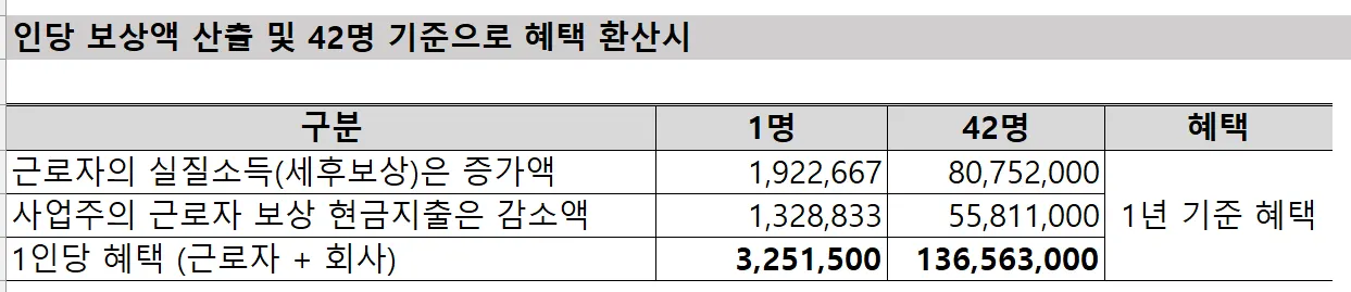 근로자와 사업주 합산 혜택은 인당 3,251,500원, 42명 기준으로는 총 136,563,000원의 혜택이 발생합니다.