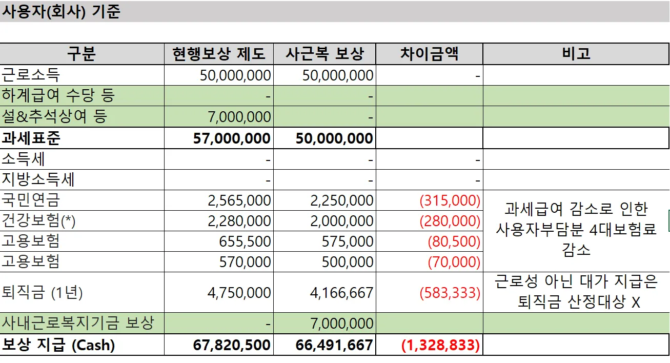 사업주는 과세급여 감소로 인해 국민연금, 건강보험, 고용보험 부담이 각각 감소하며, 총 보상 지급(Cash)은 67,820,500원에서 66,491,667원으로 1,328,833원 감소합니다.
