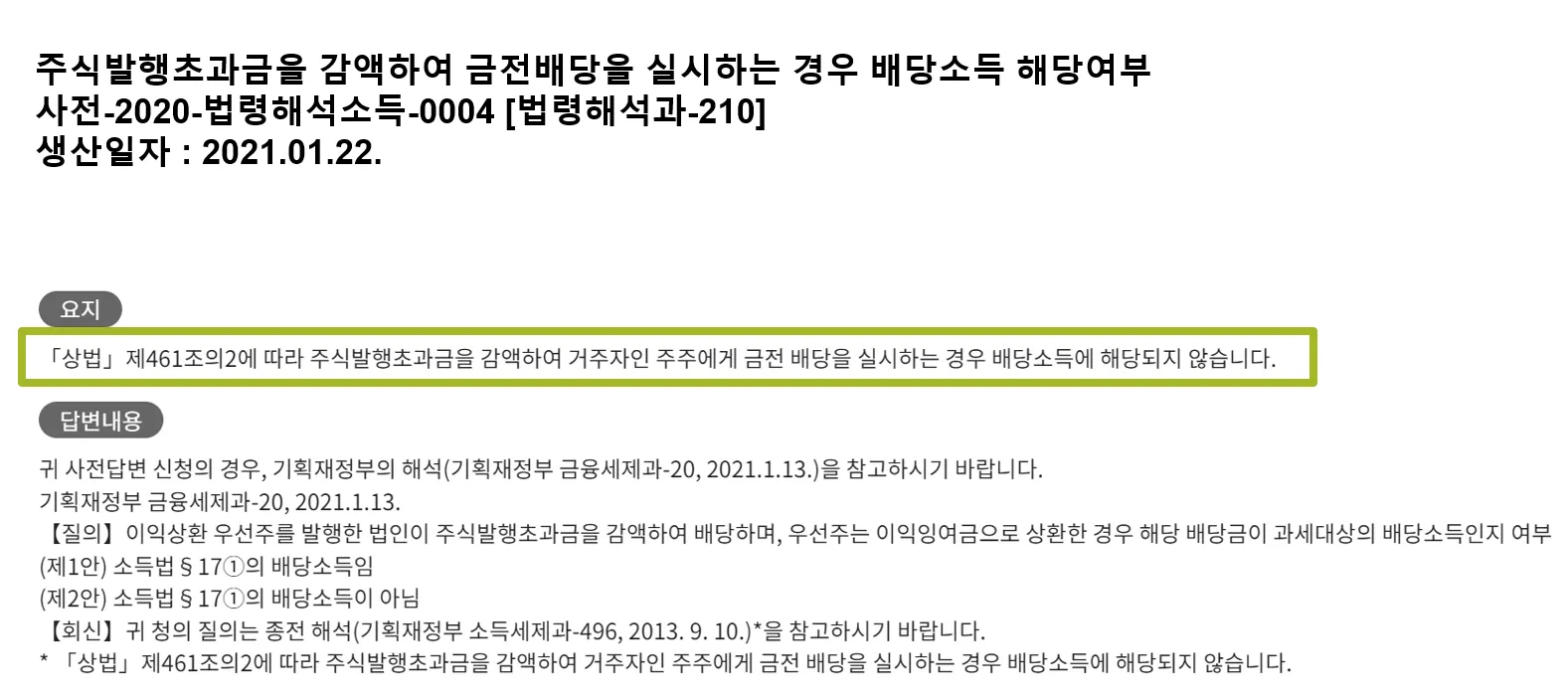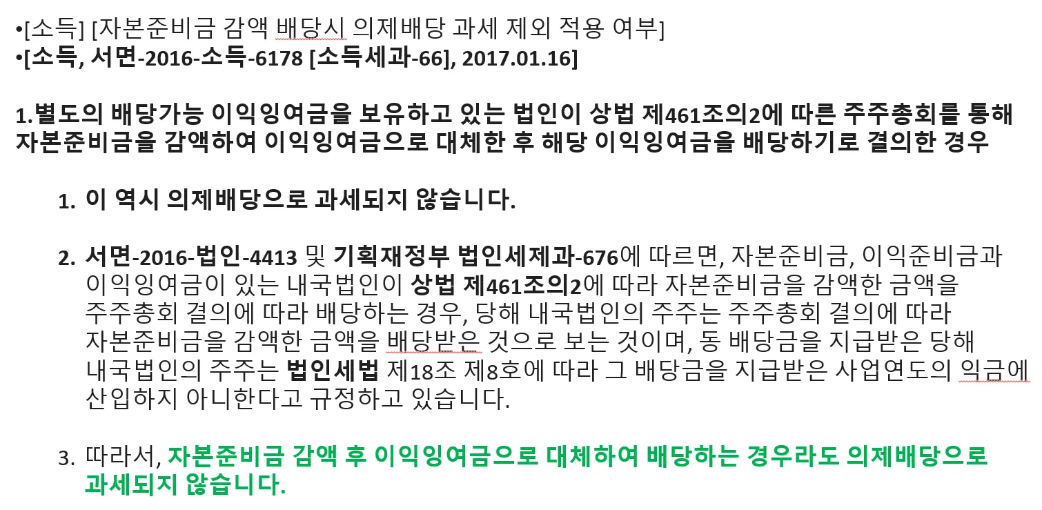 자본준비금은 자본 거래로 쌓인 잉여금을 재원으로 한 것이므로, 이를 재원으로 한 배당은 납입자본의 반환으로 본다.